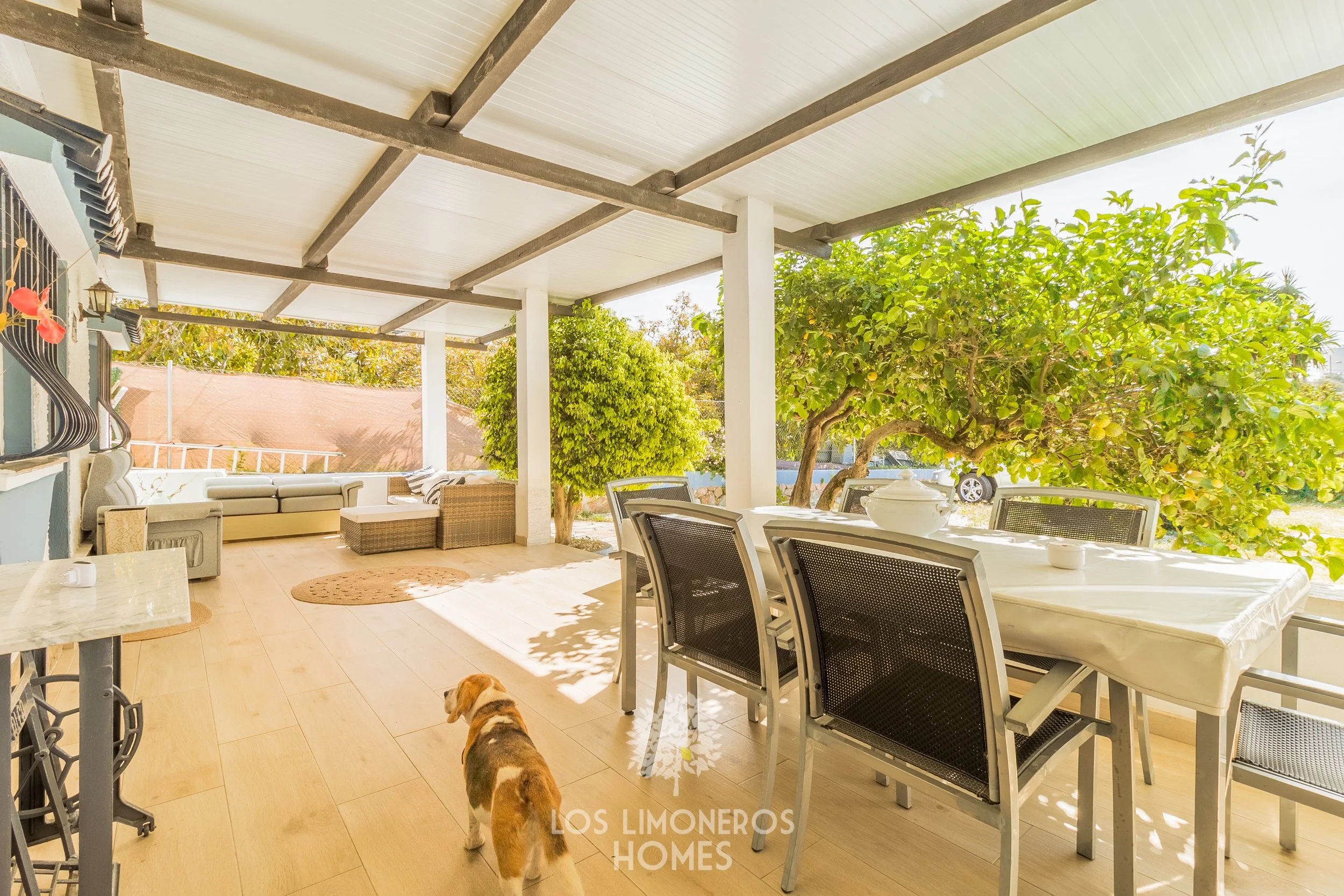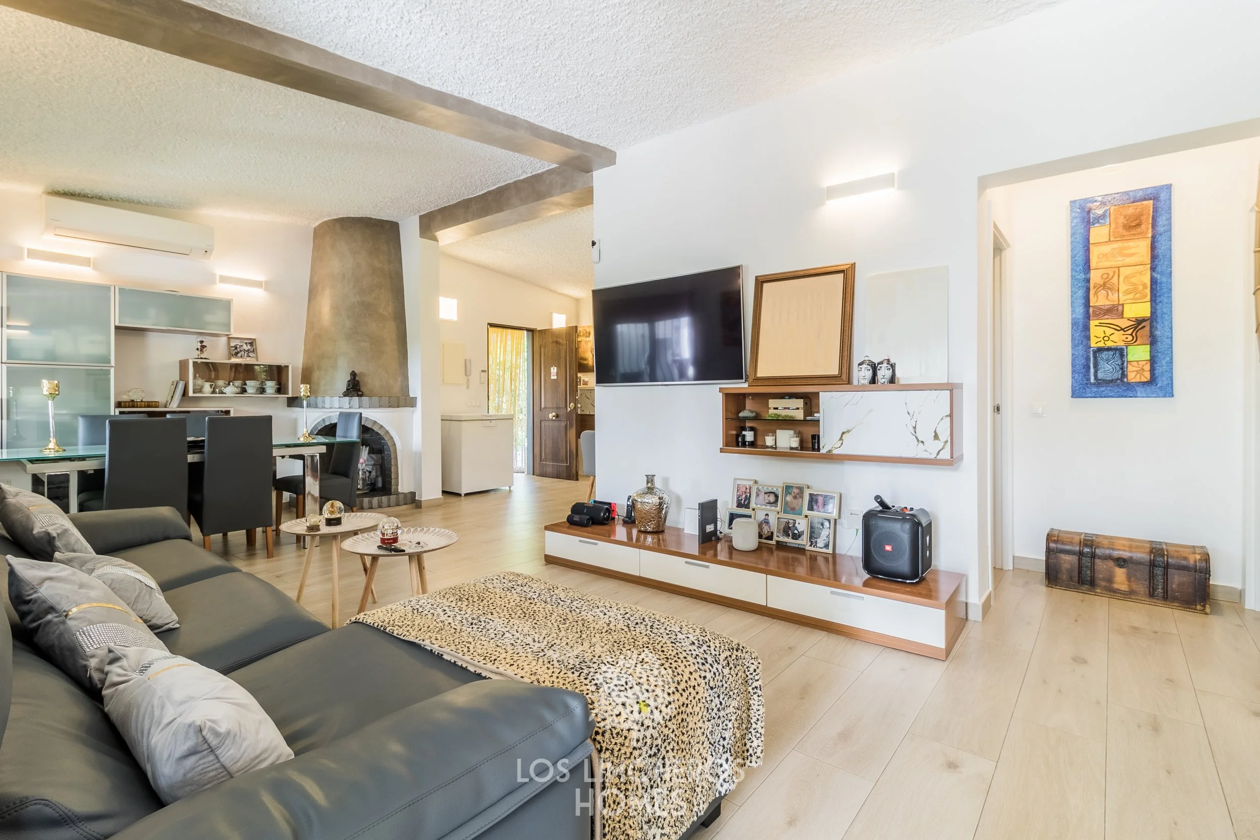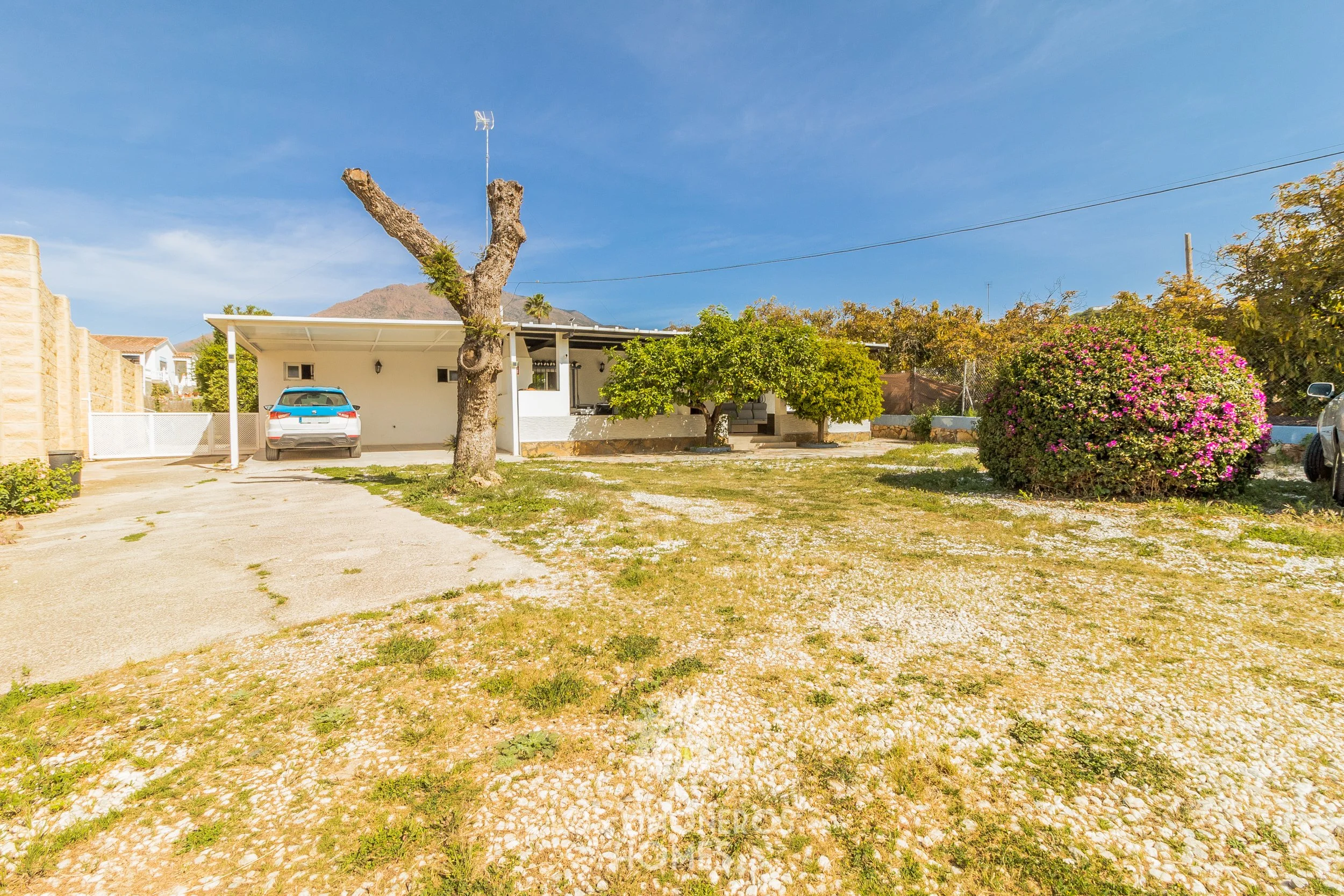 La propiedad se asienta sobre una amplia parcela rectangular de 2.800 m², ofreciendo privacidad y múltiples posibilidades. La vivienda, de 90 m², ha sido recientemente renovada y se distribuye en dos dormitorios dobles, un baño completo en el interior y un segundo baño con acceso independiente desde el exterior, ideal para mayor comodidad en zonas de piscina o invitados. Dispone además de un luminoso salón-comedor con chimenea y aire acondicionado, integrado con una cocina abierta totalmente equipada.